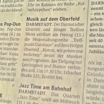 Der Saal des Gutshauses auf dem Oberfeld, ein Ort, an dem Geschichte lebendig wird. Wie geschaffen für eine Reise, die nach innen führt. Für eine Expedition, bei der man neue Einblicke gewinnen und scheinbar Vertrautes auf neue Art wahrnehmen kann. Mit Liedern von Begegnungen, von Veränderung, von magischen Momenten und von der Lust, Grenzen zu überschreiten.